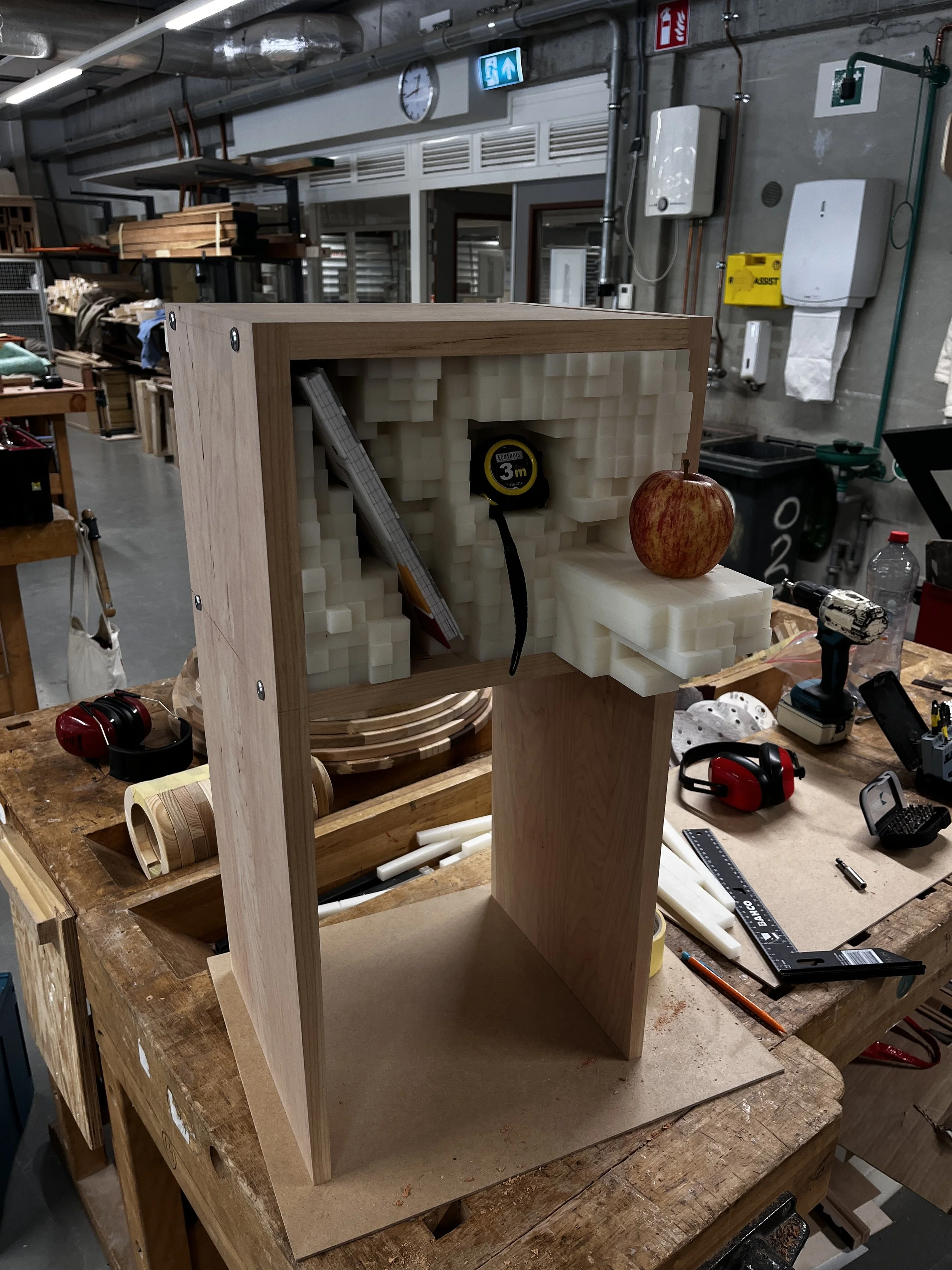 I wanted to make this interaction visible, somehow create a pattern that is unique to the action of the user. After 6 weeks of designing and experimenting I came up with a collection of a picture frame and small storage cabinet.